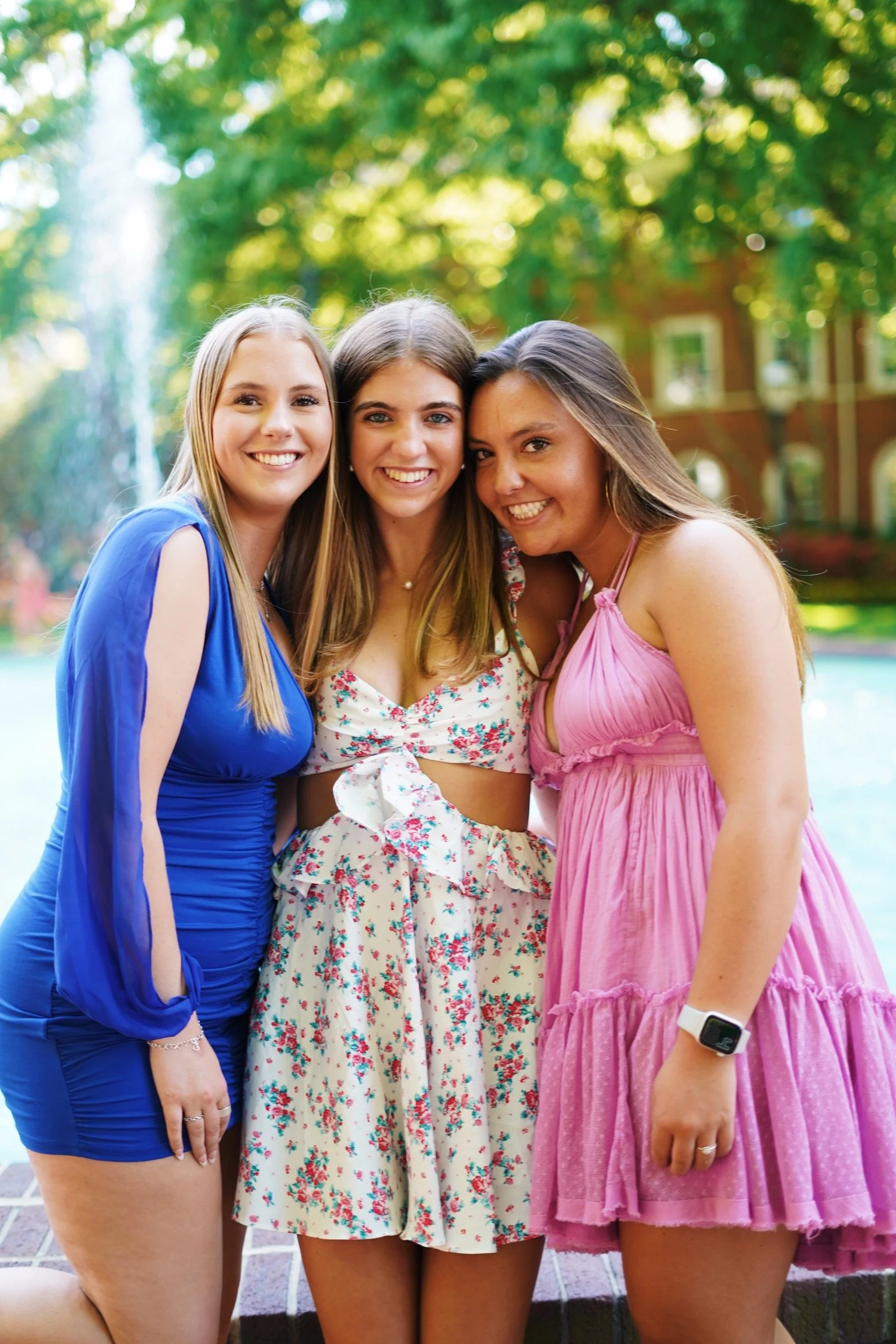 Three young women in colorful dresses smiling outdoors near a fountain.